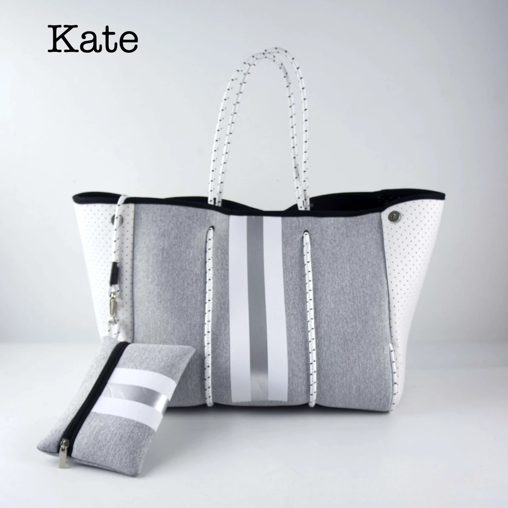Designed to last, this neoprene tote is the perfect blend of luxury, style, and functionality to take on the go! The best bag you will ever own! Removable Pouch secured by lobster clasp, side panels expand for more capacity with magnetic snap for a streamline look. Perfect for the beach, work, kids sporting events, or a night on the town….the most functional bag you will own!