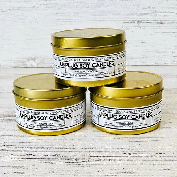 These gold tin soy candles by make the perfect hostess gift or stocking stuffer.