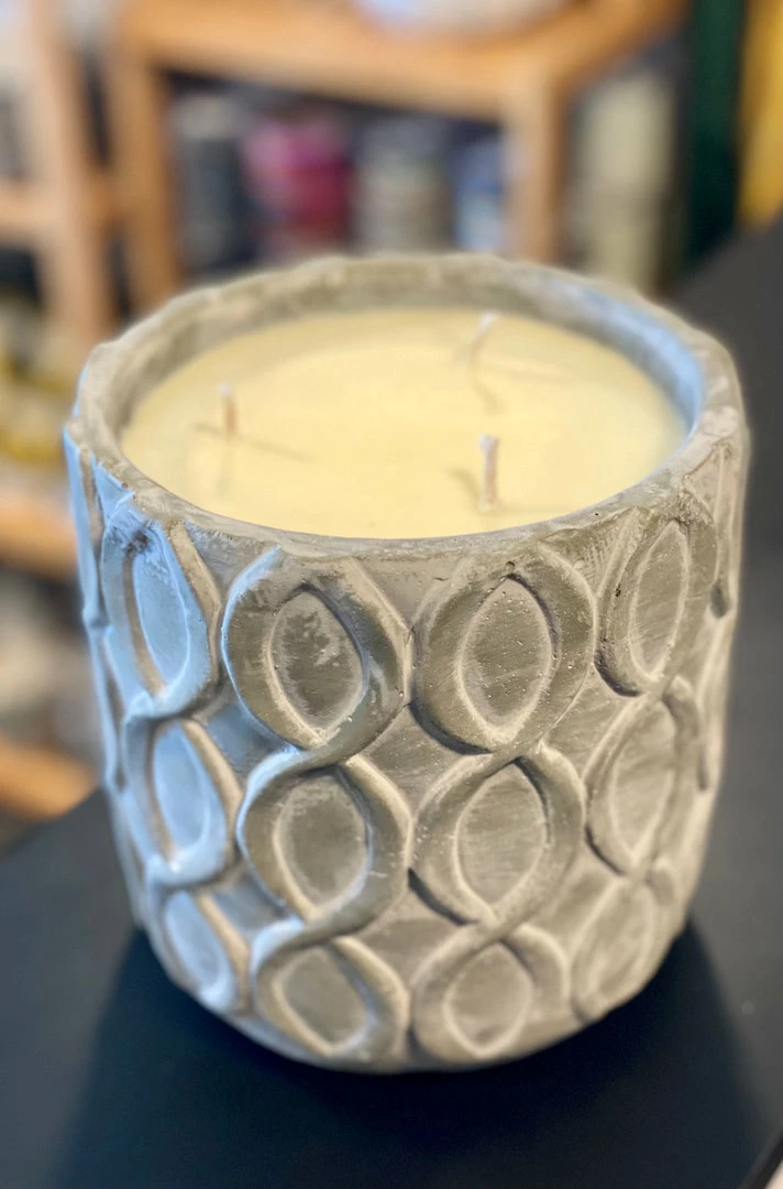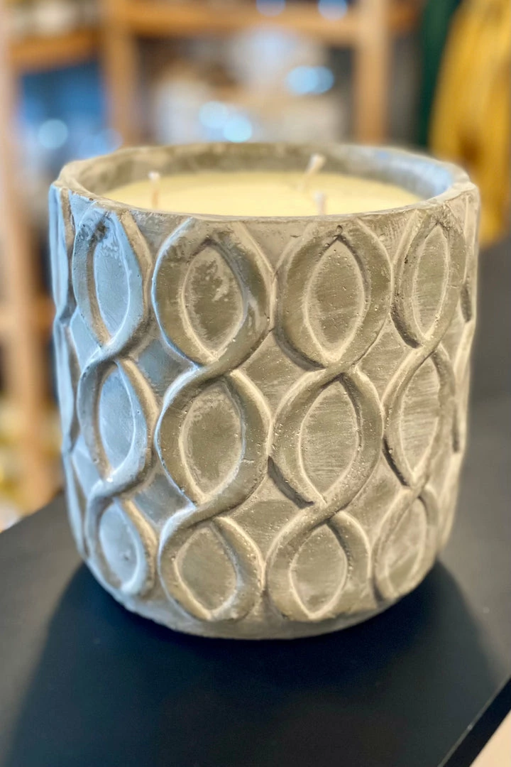 The jumbo gray stone collection by Unplugged Soy Candles has a beautiful cable-knit texture around the stone container. Each container has variations of light and dark gray distressing that adds a unique touch to our highly-fragrant candles. These gray stone containers are loved by customers, whether they prefer traditional, contemporary or rustic decor in their homes.