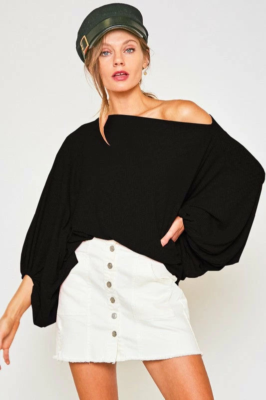 SOLID RIB BOAT NECK BALLOON SLEEVES KNIT TOP