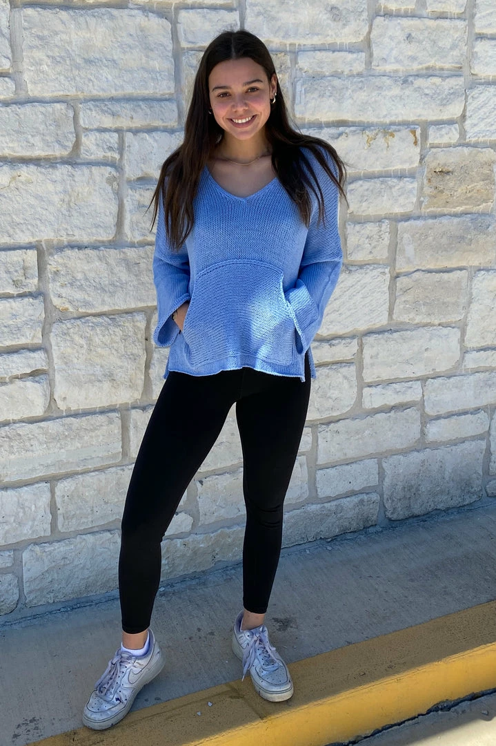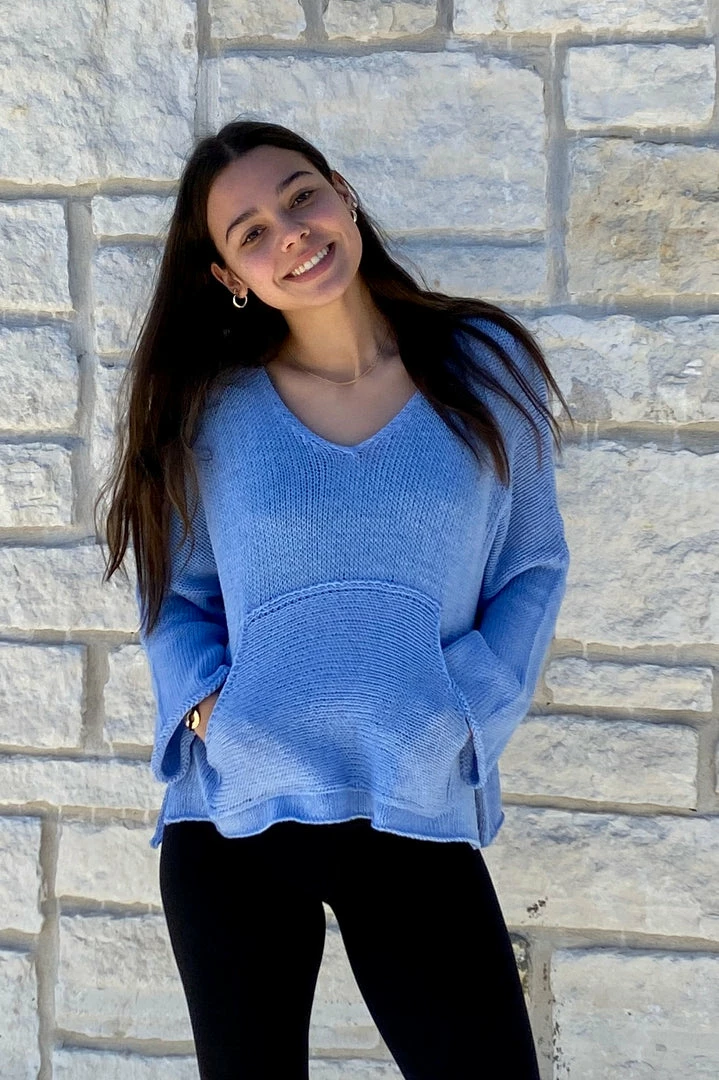 Made with amazingly soft, light and breathable cotton blend yarn, this boxy fit top features a deep v neckline and front pouch pocket. The dropped shoulder creates an extra slouchy fit. This top is perfect for an easy, go-to layer all summer long.