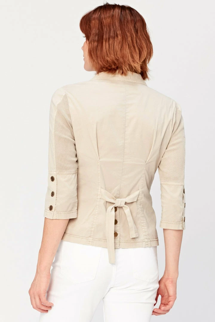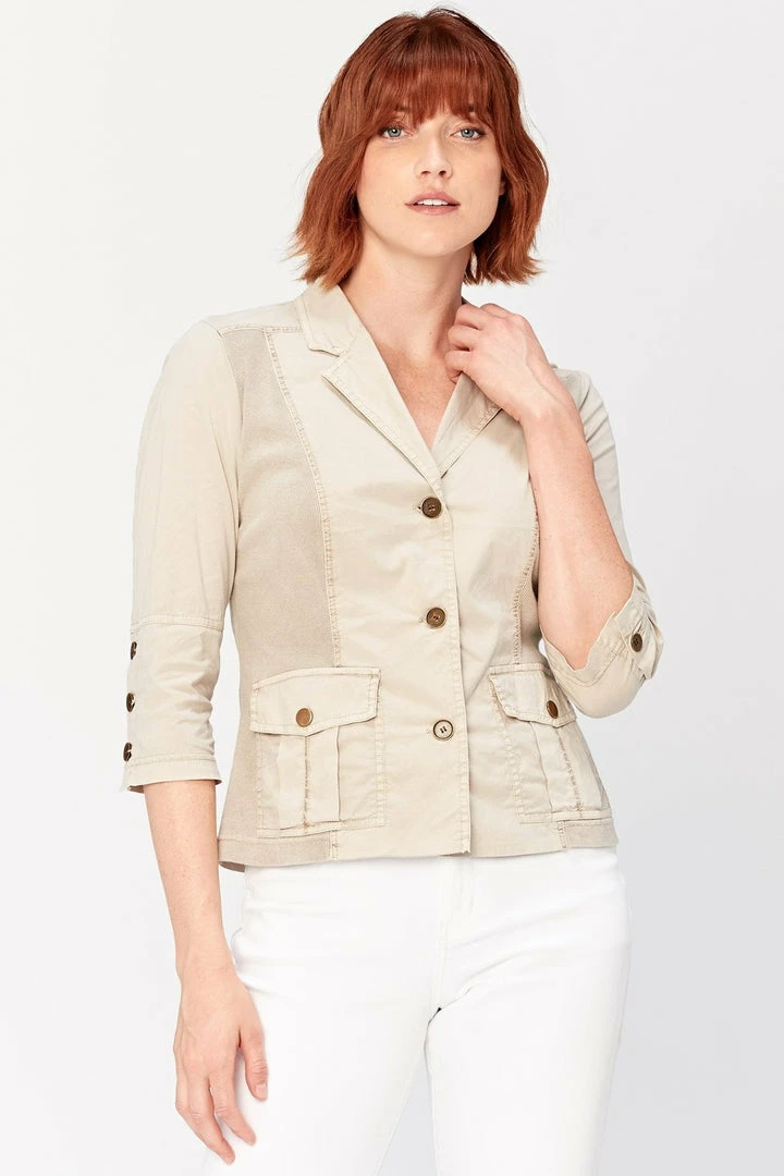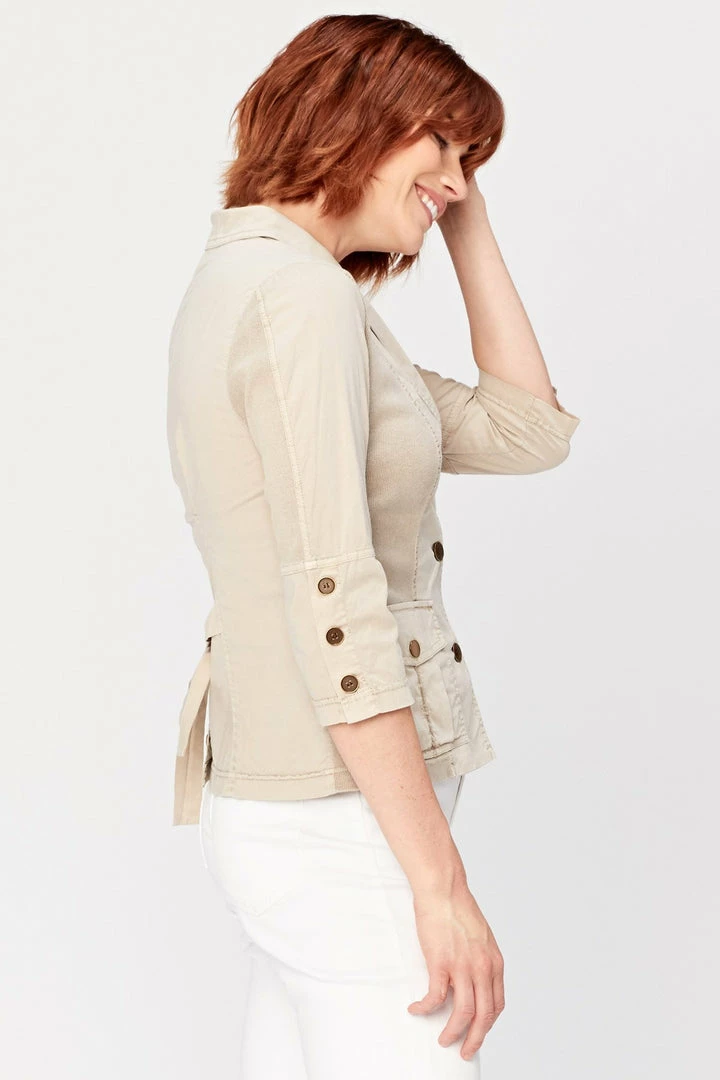 This poplin jacket features a classic notched lapel and a three-button front, patch cargo pockets, 3/4 sleeves with button cuff details, a tie at back waist, and a three-snap slit detail, as well as jersey inserts at sides and sleeves for an impeccable fit.