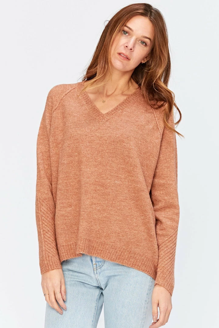 An easy v-neck sweater with raglan sleeves, rib details at cuff and rounded hem, and style lines at center back.